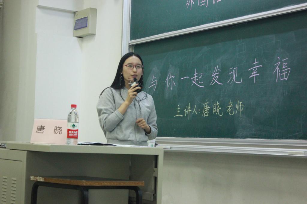此外,唐老师向大家解读了由米哈里提出的著名心理学概念:心流体验。这种类似于武侠小说中的天人合一状态的体验能大大增加人的幸福感。挑战性、明确目标、即使反馈三者合一,幸福感就自然而然的出现了。唐老师希望大家都能获得自我认同感。自己是什么样的人?自己将去何方?自己在社会中扮演何种角色?通过这样一系列对自我意义的探究,大家将真正了解人生的价值,获得自身的健康发展。最后,唐老师提出幸福是不断持续的功课,是持续不断的实践,要在生活中寻找幸福,体验幸福。
