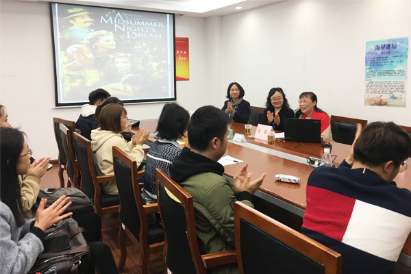 张薇老师首先向大家介绍,《仲夏夜之梦》是莎士比亚一部充满诗意和幻想的喜剧,它是双重庆典,具有浓烈的狂欢气氛,小精灵帕克张冠李戴使情人们关系错乱,三对情人历经曲折终于结为伉俪,六工匠为婚礼助兴搞笑出演殉情戏,仙界、现实、梦幻交织在一起,虚虚实实,美丑人兽,光怪陆离,俨然是森林狂欢,谱写了一曲仲夏之夜的梦幻曲。