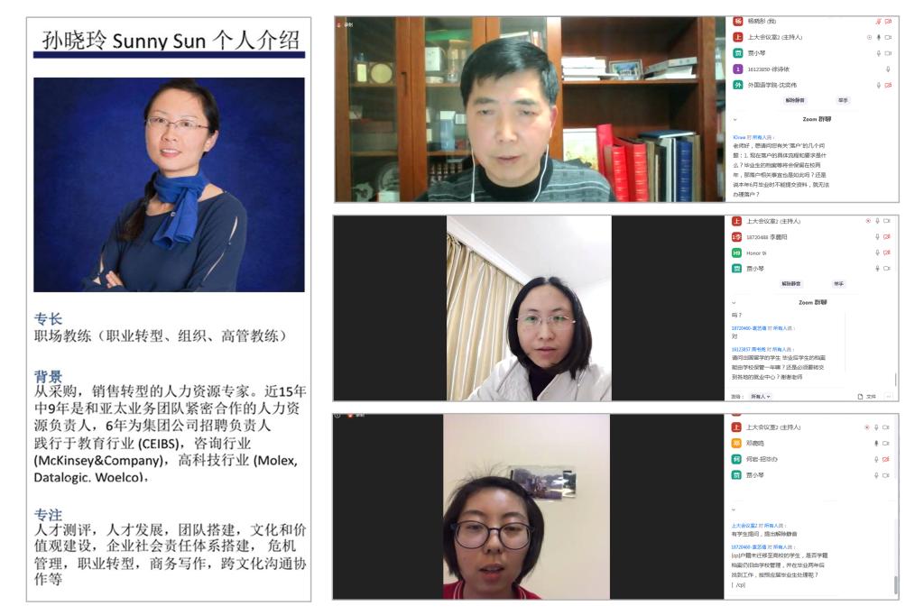 接着,针对同学们关于就业的系列困难,HR孙晓玲女士作出详细解答。对于所有毕业生都关心的线上视频面试的问题,孙女士认为在面试前可以与面试官主动提出视频测试并尽量确保网络硬件正常,以避免突发情况。同时她认为,同学们需要多了解面试官的背景与职位情况,并且在面试前做好自身准备,着装整洁、心态放松并化淡妆等;对于疫情带来的春招机会减少问题,孙女士认为大家要持续关注招聘网站,并且多发动身边的社会关系扩大交际范围,提高自身的软技能实力,在严峻的就业形势中提高自己的竞争力。此外,同学们就自己的个性问题与现场专家老师们互动交流,对于大家提出的对三方协议的签订、落户的相关政策感到疑问,招毕办何岩老师为大家进行解答,并提醒同学们关注“上大就业”官方微信公众号,了解就业相关详细流程。