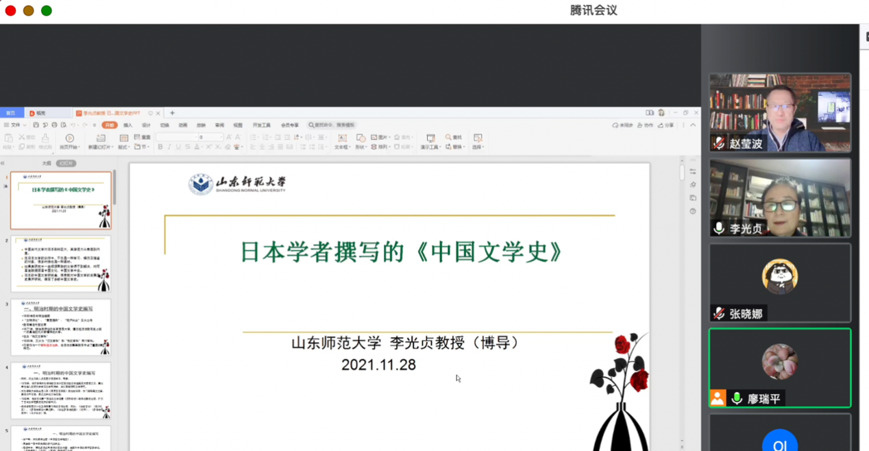 11月28日晚,sunbet日语系、英语系120余名师生在线聆听了山东师范大学sunbet日语系主任李光贞教授为我们开设的题为“日本学者撰写的《中国文学史》”的讲座。本次讲座是日本龟甲万公司提供的“MURASAKI紫”奖学金高端学术讲座的第十三讲,由日语系主任赵莹波教授主持。