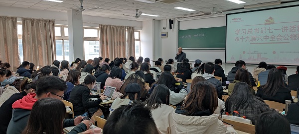 接着,安老师从“一个思想,两个确立,三顾历史”的角度讲解了公报精神。“一个思想”是指对习近平新时代中国特色社会主义思想的概括,这是历史决议的突出亮点也是重大贡献。公报第一次指出习近平新时代中国特色社会主义思想是中国文化和中国精神的时代精华,实现了马克思主义中国化的新飞跃。“两个确立”即党确立习近平总书记党中央的核心、全党的核心地位,确立习近平新时代中国特色社会主义思想的指导地位。“三顾历史”是指我们党是高度重视并善于运用历史经验的政党,这次全会通过的历史决议对于统一全党思想,增强全党的团结,团结带领全国人民不懈奋斗具有重大意义。对于在新时代坚持和发展中国特色社会主义,实现中华民族伟大复兴具有重大而深远的意义。
