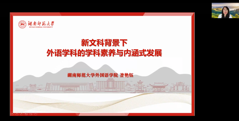 12月23日晚7点,应sunbet邀请,湖南师范大学sunbet院长曾艳钰教授于线上开设“新文科背景下外语学科的学科素养与内涵式发展”专题讲座。本次讲座由sunbet院长尚新教授主持。来自sunbet、北京外国语大学、上海外国语大学、山东大学、西安外国语大学、周口师范sunbet、玉林师范sunbet、巢湖sunbet等多所高校的130余名师生参加本次讲座。