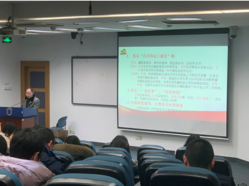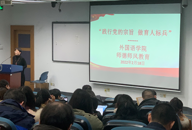 首先,在师德师风教育专题报告环节,英语系员工白岸杨以“如何践行党的宗旨,做育人标兵”为题做了分享。白老师表示,员工不仅充当教书育人的角色,也参与了员工人生的塑造,如何把运用工具与培育员工融合在一起,实现知识传授、能力培养及立德树人价值塑造三位一体是员工需要思考的方向。白老师结合丰富的教学案例,对于党员员工如何在自身岗位上做到有理想、为人民服务等提出了自己的见解。