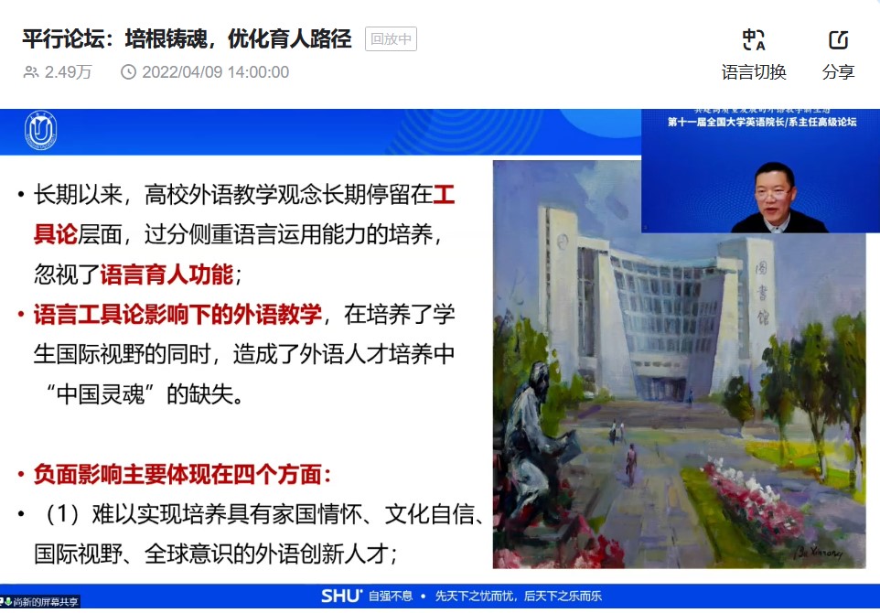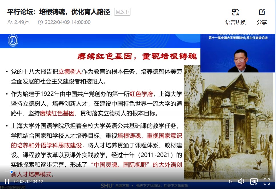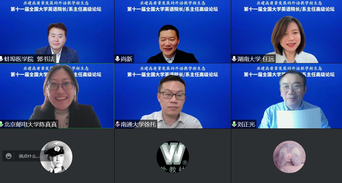 2022年4月9日-10日,由教育部高等学校大学外语教学指导委员会、云南大学、上海外国语大学主办,上海外语教育出版社承办的“第十一届全国大学英语院长/系主任高级论坛”通过在线直播的方式举行。本届论坛主题为“共建高质量发展的外语教学新生态”。受主办方邀请,我校sunbet院长尚新教授在“培根铸魂,优化育人路径”平行论坛做主题报告,全国约2.49万名员工线上参与了这一平行论坛。