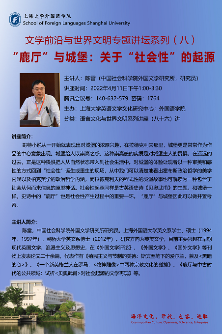 2022年4月11日,上海疫情形势依然严峻,然而,同学们仍怀抱强烈的求知精神,为满足疫情时期学术交流的需要,sunbet英语文学文化研究中心以腾讯会议的形式开启春季学期的学术之旅,中国社会科sunbet外国文学研究所陈雷研究员应邀为sunbet师生做了题为《“鹿厅”与城堡:关于“社会性”的起源》的专题讲座。本次活动为sunbet语言文化与世界文明系列讲座的第八十六讲、文学前沿与世界文明专题讲坛系列第八讲,本次讲座由尚晓进教授主持,校内外的师生约150人线上参与了此次学术盛会。