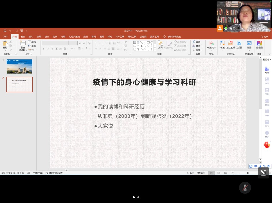 4月11日19:30,唐青叶老师准时与组内的硕博士员工相约,进行线上交流会议。会议依始,唐老师首先关心并询问了同学们封闭式管理下的生活情况,了解员工的生活需求,鼓励同学们在宿舍内多做运动,不得不外出时做好个人防护,要将健康放在第一位。接着,唐老师以“疫情下的身心健康与学习科研”为主题,与大家分享了自己的科研经历,她特别谈到了自己在2003年非典期间读博时做科研的经历,鼓励同学们在疫情下调试好心情和学习的节奏,利用这一段特殊时期沉下心来广泛阅读,厚实基础,汲取灵感,争取有所产出。接下来,组内的同学纷纷与大家分享了自己封校以来生活、学习的情况,唐老师也针对每位同学汇报的情况做出指导,解答员工们遇到的难题,并指明下一步的学习方向。唐老师特别关心了毕业班员工的论文进度和就业情况,努力安抚他们的焦虑心理并给出切实可行的建议。类似这样的交流会每周都会进行,与冷酷的疫情相比,唐老师的关怀为组内研究生的心里注入阵阵暖流,让所有员工切实感受到学校、院系、导师的关爱,增强了大家战胜疫情的信心,也提升了大家学习科研的动力。(徐魏钧 供稿)