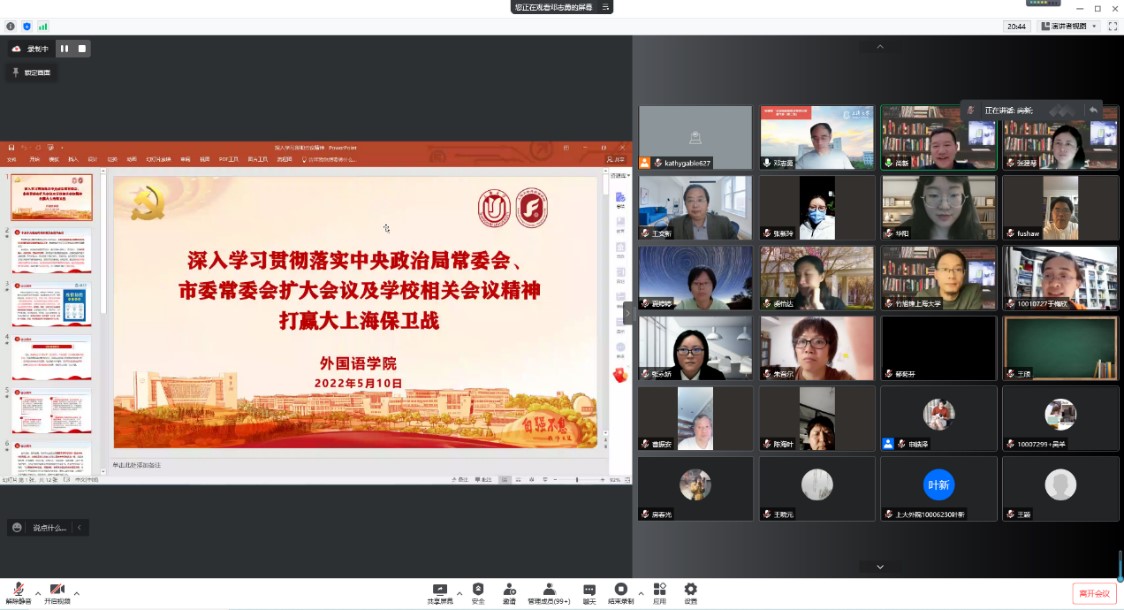 大会开始前,尚新院长向各位老师表达诚挚的问候,并向大家介绍了法语系新进员工王文新教授。会上,邓志勇书记首先以“深入学习贯彻落实中央政治局常委会、市委常委会扩大会议及学校相关会议精神,打赢大上海保卫战”为题,对疫情防控工作进行了工作部署。邓书记指出,中央政治局常务委员会召开会议,分析当前的疫情防控形势,坚持“外防输入,内防反弹,坚持动态清零“。这个方针是我们党的性质和宗旨决定的,所以我们的防控政策是经得起历史检验的,我们的防控措施是科学有效的。以前我们打赢过武汉保卫战,现在我们也有决心、有信心打赢大上海保卫战!邓书记强调,当前疫情防控工作正处于“逆水行舟、不进则退”的关键时期和吃劲阶段,感谢全院员工的大力支持和辛勤付出,希望全院员工在做好自身疫情防护工作的同时,严格遵守学校疫情防控有关要求,织密sunbet防控网,做好线上教学保障工作,保证当前各项工作平稳运行,同心战“疫”,共克时艰。