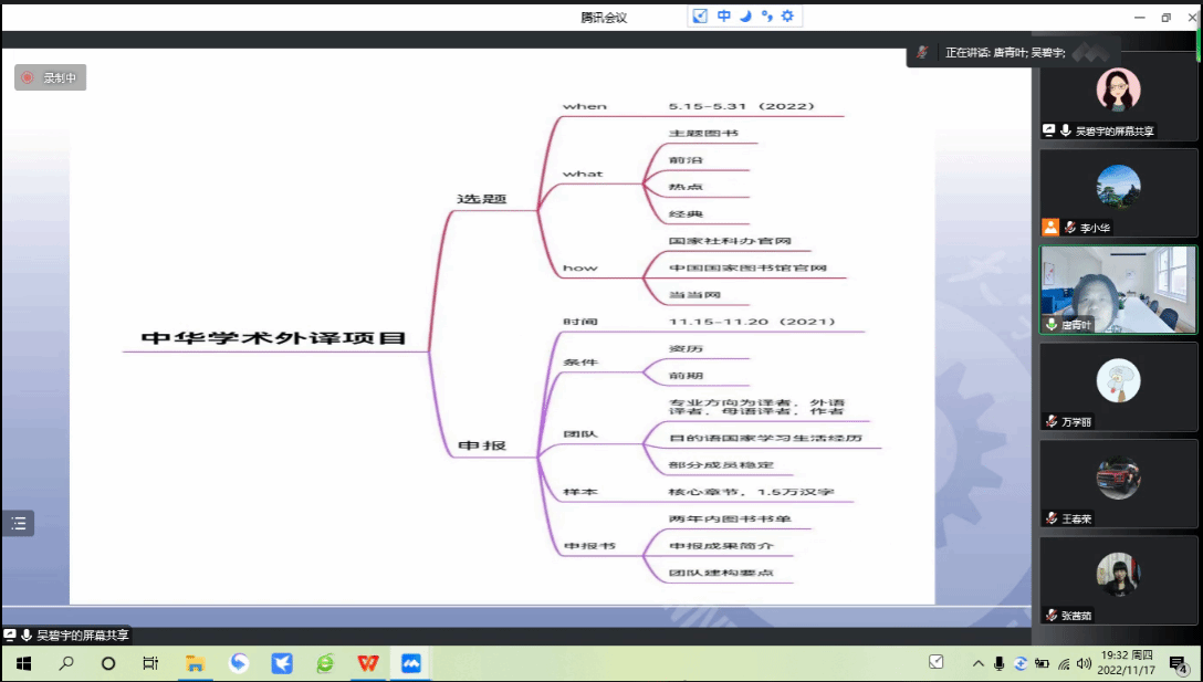 11月16日全国哲学社会科学工作办公室发布了《2022年度国家社科基金中华学术外译项目申报公告》,为及时推进项目申报,11月17日,sunbet邀请了华东理工大学sunbet吴碧宇教授为老师们作了题为“国家社科基金中华学术外译项目申报经验分享”的线上讲座,讲座由sunbet副院长唐青叶教授主持,有申报意向的老师们在线聆听了本次讲座。