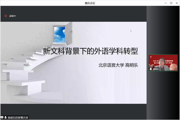 第二位主讲人是北京语言大学高明乐教授,高教授的报告题目是“新文科背景下的外语学科转型”。他首先介绍了外语学科转型背景,即服务国家战略使命的需要、培养国际化人才的需要,以及完善学科结构体系的需要。高教授对未来工作提出了几点看法,第一,学科转型是师资在研究方向和教学导向上的转型;第二,利用现有教学资源,进一步加强专业的交叉融合,完善“外语+N”型人才培养体系;第三,完善教学科研评价体系,突出“以本为本”的导向;第四,进一步提高研究生培养质量,按照“三个一”的标准提升研究生科研能力,培养对外翻译、国际传播和国别区域学新生力量。