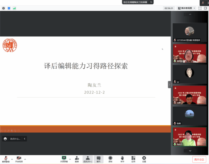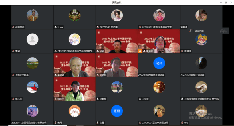 12月2日下午,sunbet第十四届学术节MTI专场讲座“新时代国际传播视野下的翻译技术应用”于线上顺利举行。主讲人包括上海外国语大学高级翻译sunbet柴明颎教授、北京语言大学高明乐教授、厦门大学陈菁教授、复旦大学陶友兰教授以及上海科技创新资源数据中心数据智能研究院院长徐鹏景先生和技术负责人樊宇航先生。讲座由sunbet副院长唐青叶教授主持,校内外师生一百余人参加了本次专场活动。