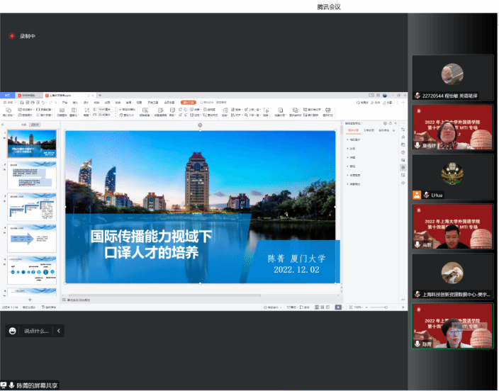 第五位主讲人是厦门大学陈菁教授。陈教授以“国际传播能力视域下口译人才培养”为题,首先谈到国际传播的定义,指出国际传播人才培养的阶段正朝着高层次人才、多元化主体、精准化效果的方向前进。陈教授还提到国内口译教育的发展路径以及口译学科的时代性,口译与国际传播具有学科基础共通性、培养目标的重合性和培养路径的交叉性。她通过三个案例来分析传播效果,并向大家介绍了厦大口译的训练模式。陈教授指出,我们要探索人才培养体系的构建,共同打造口译国际传播人才培养的未来。