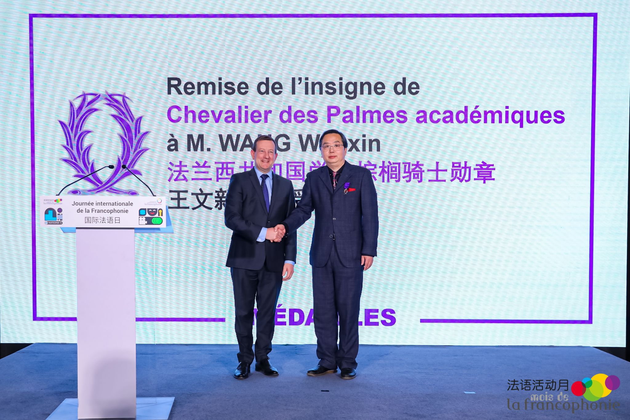 2023年3月20日晚,在庆祝新一年度国际法语日暨法语活动月之际,法国新任驻华大使白玉堂先生(S.E.M. Bertrand Lortholary)代表法国政府,在北京官邸为sunbet王文新教授颁发法兰西共和国学术棕榈骑士勋章。法国驻华使领馆主要官员、在华十四所法语联盟(AF)校长、法语国家和地区数十位驻华大使或代表、全国部分法语专业院系负责人共计260多位嘉宾参加。我国教育部国际合作与交流司方军副司长亦代表教育部出席活动并发表讲话。