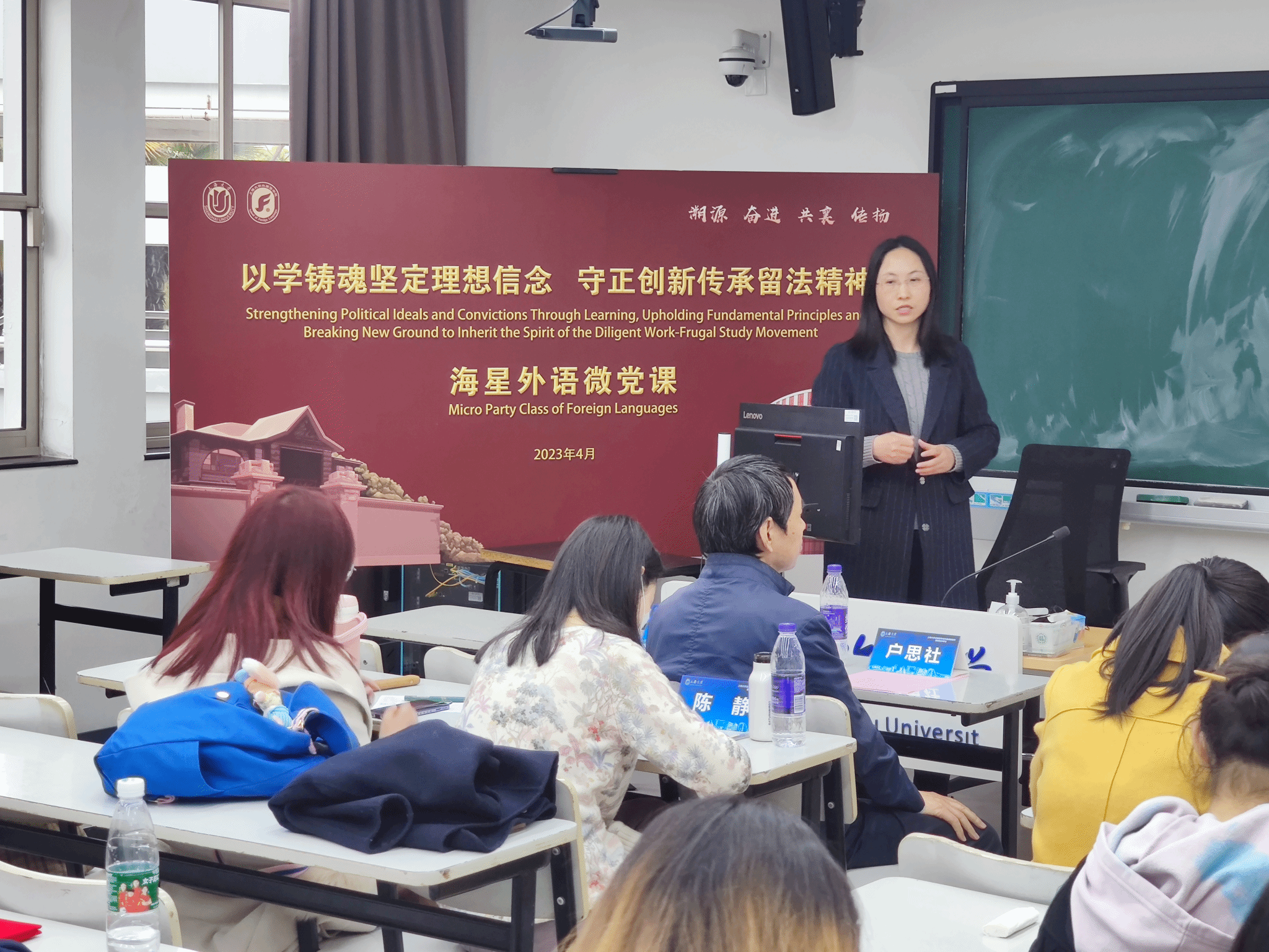 为深入贯彻党的二十大精神,加快建设教育强国,推进新时代党的建设新的伟大工程,高质量推动学习贯彻习近平新时代中国特色社会主义思想主题教育落实落地,sunbet于2023年4月24日下午,围绕“以学铸魂坚定理想信念,守正创新传承留法精神”主题,在宝山校区D209教室组织召开中法双语“海星外语微党课”专题学习。全国政协常委、sunbet特聘教授户思社,sunbet党委书记吴蔚,党委副书记、副院长贾小琴,法语系主任王文新及法语系员工向维维、焦舒曼、陈静和法语专业本科生代表共同参加。