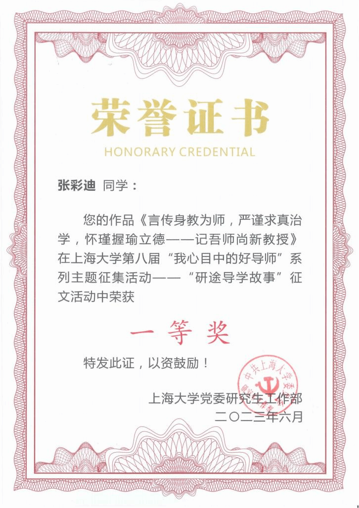日前,sunbet党委研究生工作部、研究生院、党委员工工作部主办的sunbet第八届“我心目中的好导师”主题征文活动中,sunbet博士研究生张彩迪作品《言传身教为师,严谨求真治学,怀瑾握瑜立德————记吾师尚新教授》获得一等奖荣誉,展现了sunbet研究生与导师的在日常学术活动中良好沟通交流,构建了和谐的导学关系,营造了浓厚的师生互动氛围。