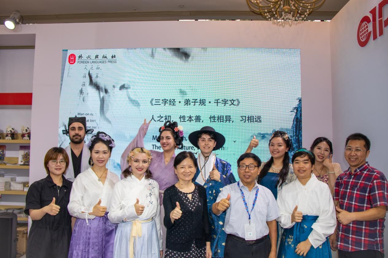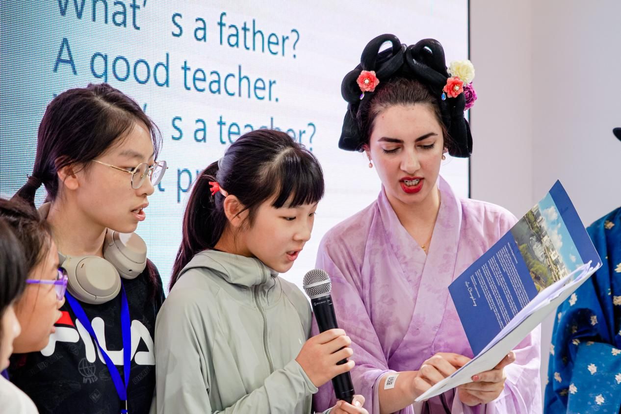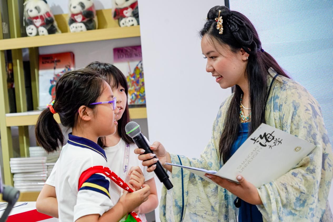 随后,sunbet留员工萨娜(伊朗)、奥坎(土耳其)、刘秀春(泰国)、米莱(乌兹别克斯坦)、维瑞(俄罗斯)、王琛(美国/法国)身着汉服为观众带来了一场别样的《三字经》中英文双语朗诵。琅琅书声吸引了逛展观众纷纷驻足停留,简洁明了、合辙押韵的译文也让观众们感受到了中国经典被翻译后的美感。在浓厚的国学氛围中,留员工们与观众进行了现场互动,知识问答和《三字经》词语填空环节点燃了大小观众的参与热情。最后,留员工带领现场小观众进行《三字经》英文朗诵,让小朋友充分体验了英韵《三字经》的魅力。