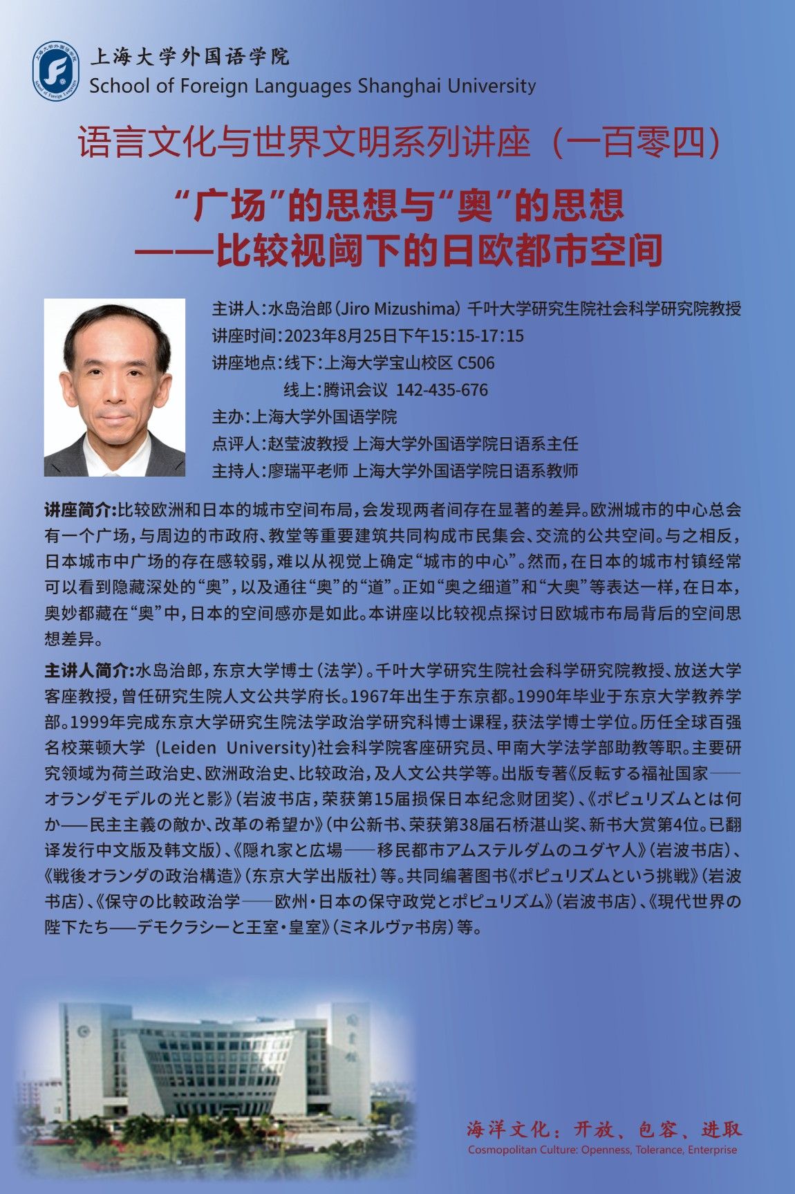 离离暑云散,袅袅凉风起。金秋时节,又恰逢新学期伊始之季,日本千叶大学研究生院社会科学研究院水岛治郎教授应邀于8月25日下午为外语sunbet师生做了一场题为“‘广场’的思想与‘奥’的思想——比较视阈下的日欧都市空间”的专题讲座。讲座以线下+线上的形式进行,共有来自国内外知名高校的200多名师生参加。此次讲座在sunbet及千叶大学人文公共学府院级合作协议框架下实施,同时属于sunbet国际化培养“五个一”工程建设项目系列活动之一。