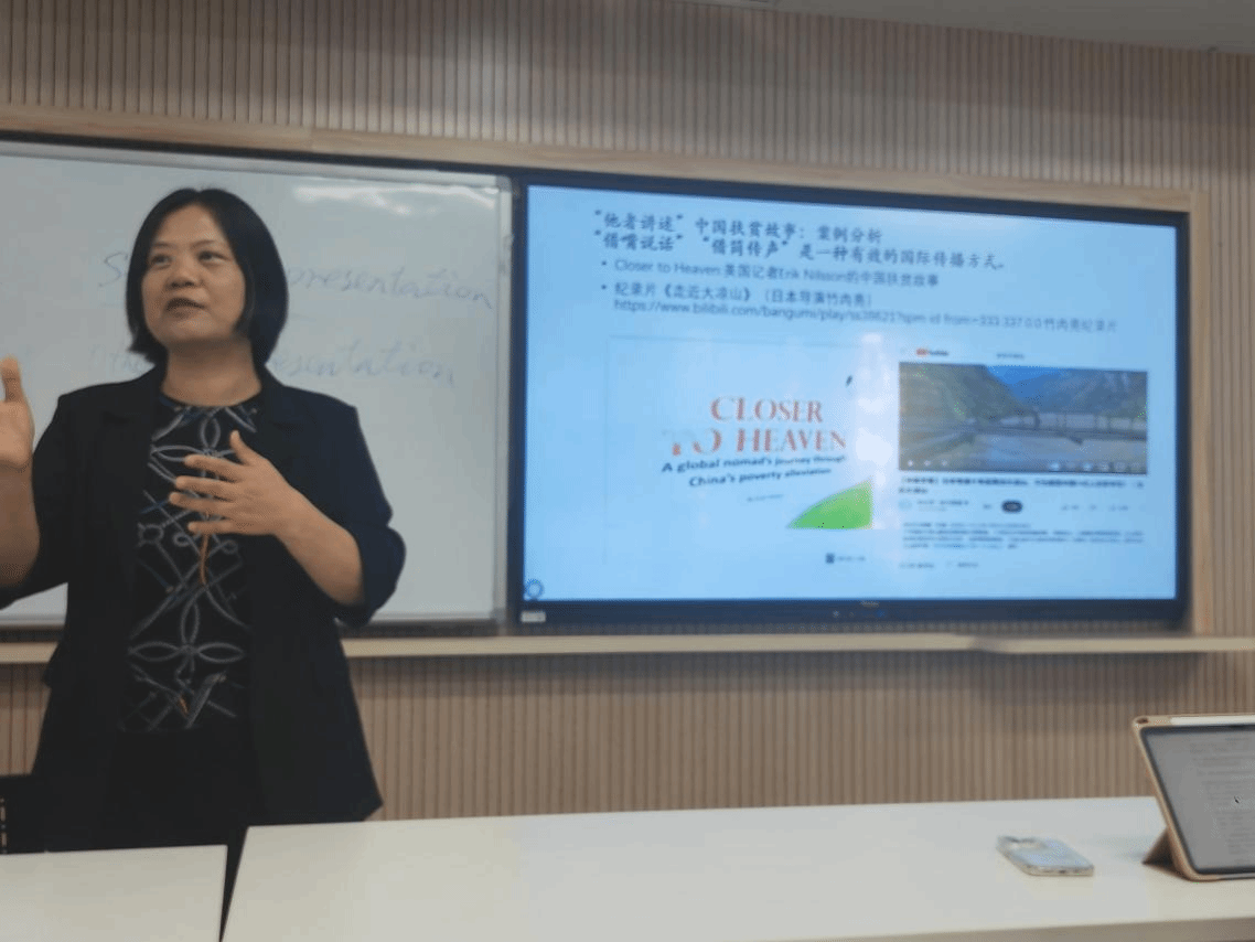 在此基础上,同学们进入国别与区域专题。唐青叶教授以个人研究项目出发,从“一带一路合作倡议”在国外媒体中的评价,讨论英语在战略性跨文化传播中的重要性。唐教授强调培养区域国别研究人才迫在眉睫,并以此对未来英语专业的育人方向提出了指引性的建议。