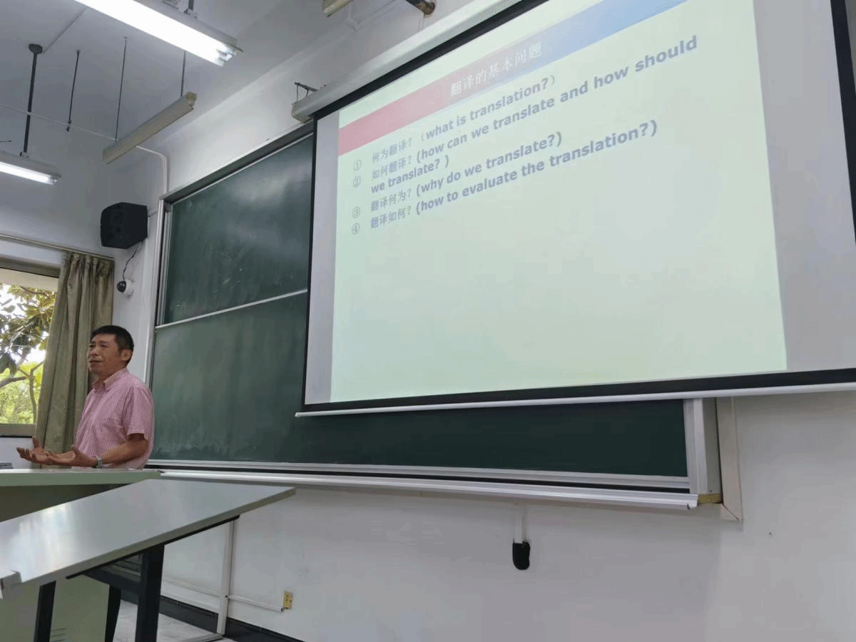 继英美文学之后是翻译研究专题,由傅敬民教授和赵彦春教授主讲。傅教授甫一开讲便抛出“何为翻译”、“如何翻译”、“翻译何为”和“翻译如何”四个问题,他旁征博引结合自身丰富的翻译实践和翻译研究经验,步步为营地引导同学们从语言符号、翻译现象和翻译事件、翻译过程、翻译行为、译者、译文与翻译工作等多角度思考思考翻译的本质,并通过丰富的实例进一步向同学们讲解不同类型文本的翻译方法。最后他强调翻译应具有人文性并语重心长地勉励同学们要打好汉语和英语的语言基本功,提高双语素养,做出人工智能无法替代的翻译作品,同时还应拓宽视野,丰富知识储备,成为优秀的英汉翻译工作者,服务国家,服务社会,成就自我。