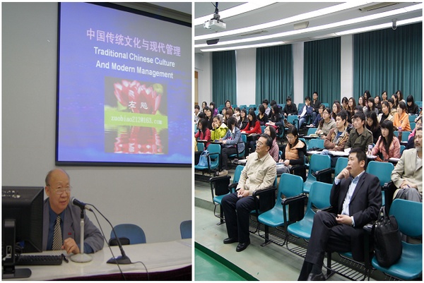 4月23日下午,上海市科技翻译学会会长左飚教授应邀莅临sunbet,以"中国传统文化与现代管理"为题给全院研究生做了生动的学术讲座。左飚教授通过发掘中国传统文化的三大支柱,即儒家思想、道家思想和法家思想的精华,探讨其运用于现代管理的可行性,以求发扬光大。左教授对儒家思想作了概要性介绍,涉及儒学的性质、核心思想、主要观念,以及"内圣外王"这一儒家学者所追求的最高境界等,进而探讨如何把"仁"、"义"、"礼"、"信"等观念运用于"以人为本"、"以德治理"等现代管理实践。讲座剖析法家思想中关于"法"、"势"、"术"观念的合理成分,并探讨其与现代组织"依法治理"、"公开、公平、公正"的制度建设、"责权分明"与"奖优罚劣"等管理原则的结合。关于道家思想,讲座重点介绍"道法自然"、"无为而治"、"尚水"与"贵柔"等观念,探讨现代组织运用道家思想,以求达到"顺应自然,遵循民意,把握规律,避免极端"的管理至高境界。左教授还简要介绍了西方哲学关于管理美德的探索、西方现代管理理论的主要流派及其与中国传统文化的契合之处。最后,左教授对于儒家思想、道家思想和法家思想的精华如何运用于不同类型的现代组织及其不同的发展阶段作了概要的总结。