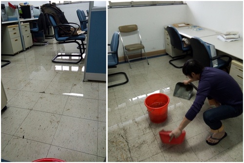 另外,由于12月9日夜间上海突遇罕见的冬季大雨,sunbet所在的C楼教学楼屋顶因下水口被堵,淤积的雨水渗漏到了四楼各办公室内。所以当10日一早上班在运送完上千袋旧试卷后,院办的黄澄老师和王新中老师就拎起水桶、拖把和畚箕来到C楼四楼员工办公室进行清理,完全靠手工作业畚箕抄水的方式将办公室地面约有五、六十桶的积水全部清空,最后用拖把拖干净地面。期间得到了李津老师的大力协助,还提供了可甩干式拖把吸水拖地,大大提高了工作效率。