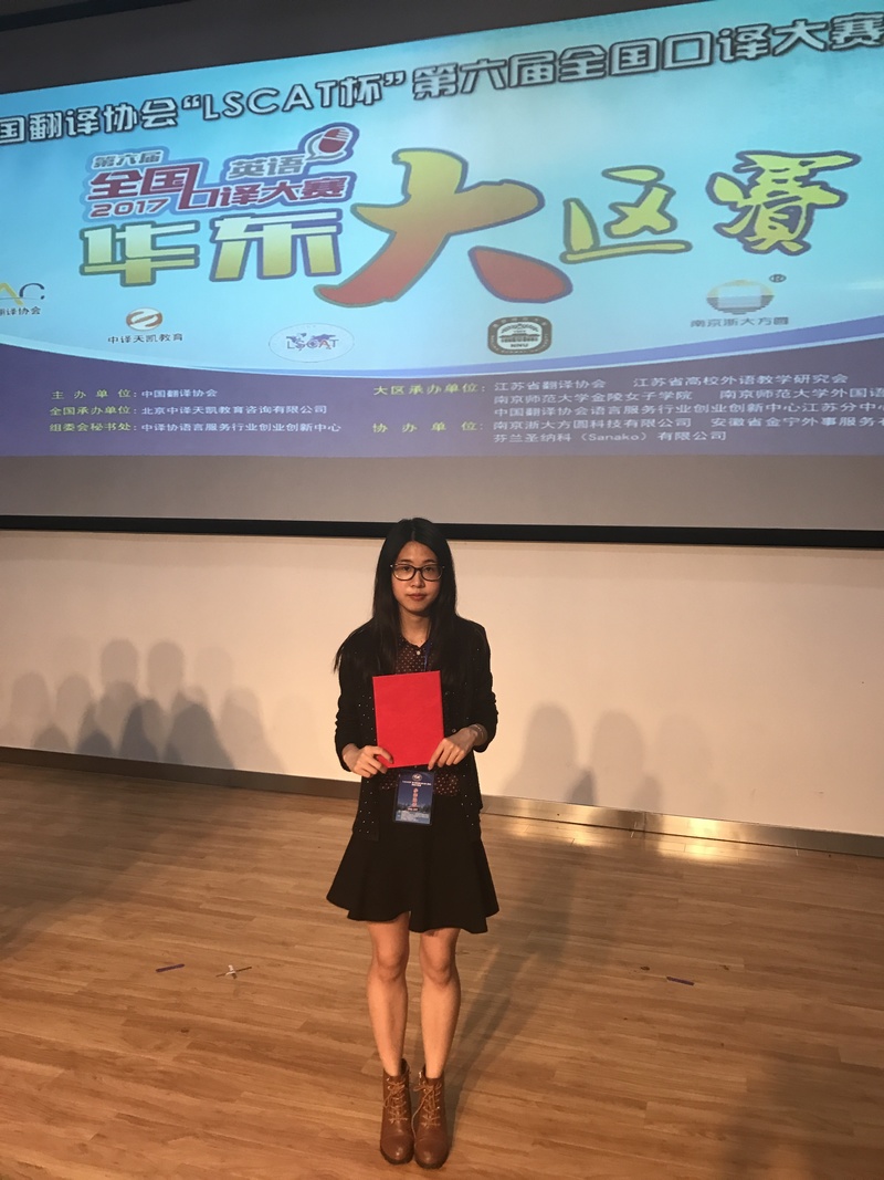 5月13日,第六届全国口译大赛(英语)"LSCAT杯"华东大区赛在南京师范大学隆重举行,华东六省一市70多所高校的150余名复赛晋级选手展开激烈角逐。在sunbet英语系朱巧莲副教授指导下,英语系大三员工周文佳荣获本次大赛二等奖,成功晋级即将在北京举办的全国总决赛,朱巧莲老师荣获优秀指导员工奖。