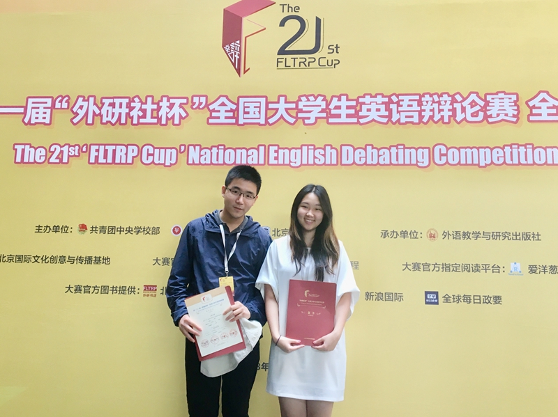 历经校选赛和各大比赛的洗礼,钱闻臻和金智睿同学已经成长为经验丰富的成熟辩手,在之前的华东赛区比赛中就以严密的逻辑、充分的论证和流利的表达从众多队伍中脱颖而出。在这次全国总决赛的比赛中,两位同学面对现场给出的国际政治、经济、宗教、女权、法律等类辩题从容不迫,在赛场上突破自我,创出了佳绩。