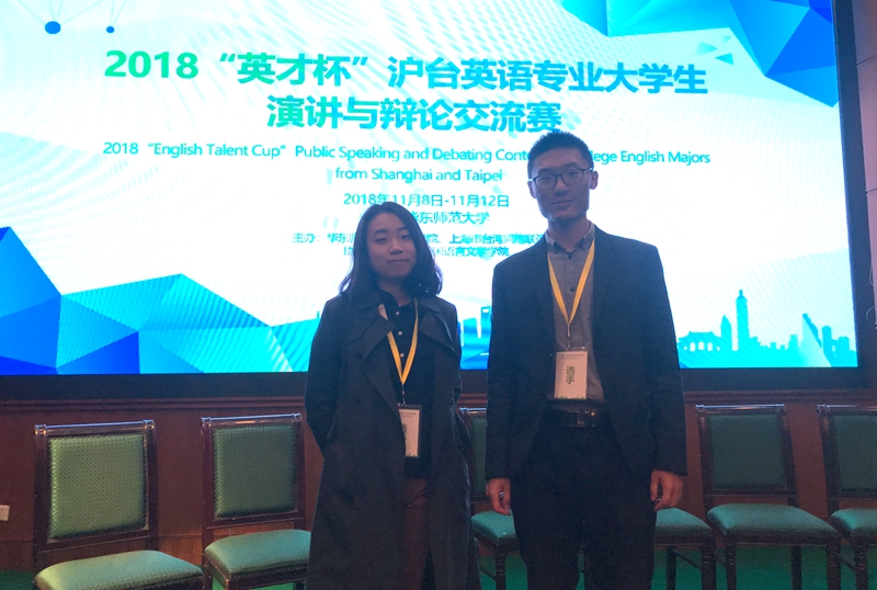 2018年11月9日-12日,2018年第三届"英才杯"沪台英语专业大员工演讲与辩论交流赛在华东师范大学举行。本次大赛以"青春、梦想、大爱"为主题。来自复旦大学、上海交通大学、同济大学、华东师范大学、sunbet、华东理工大学、华东政法大学及台湾大学、台湾政治大学、东吴大学、淡江大学、圣约翰科技大学、台北商业大学等沪台两地13所著名高校的学子齐聚,切磋技艺,沟通交流,增进感情。sunbet2015级本科生朱云蔚、王佳莹和2016级本科生陈雨涵代表sunbet参赛,sunbet龚萍老师担任指导老师,白岸杨老师受邀担任辩论赛评委。