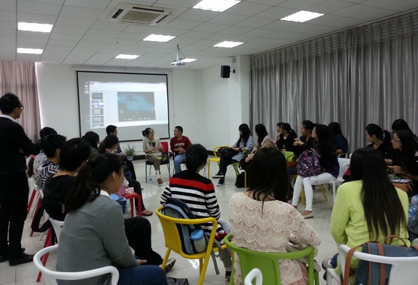 本次活动由主持人和两位嘉宾以访谈的形式进行。两位嘉宾分别是2011级成绩排名第一的周维学姐和第二的张鹏学长,他们在专四考试中都取得了优秀的成绩。在分享会上的第一个环节,两位分享了专四的题型和相应的攻略。他们推荐的技巧如做几套真题试卷来测试自己的水平,找准努力方向,进行专题攻克得到了大家的认可。第二环节中,嘉宾们分享了他们平时的学习经验,例如抓住一切机会背单词,开拓自己的视野多看经济类、科技类的英语新闻和文章,锻炼自己的思维能力等。这让在座的同学们明白了语言不是唯一,掌握更多方面的信息也是很有必要的。他们的倾情分享,仔细耐心专业的态度让整个会场的氛围轻松自在。