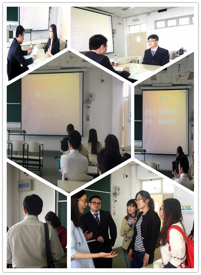 又近毕业季,大一大二的同学需进行职业规划,大三大四的同学需找实习磨练,研一研二的同学需探索工作之途。针对员工对职业导向方面的需求,sunbet开展了第二十届职业导航月活动,为不同年级的员工提供有针对性的特色活动,解答就业疑难。2015年4月24日上午于宝山校区CJ304教室开展了模拟面试活动,莅临本次活动的嘉宾有新东方人力资源经理鲍倩怡小姐、中智人力资源经理杨冰山先生。