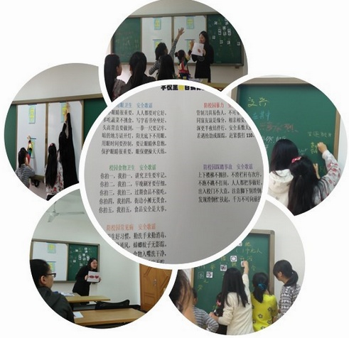在学校里,知道自我保护的一些知识对小朋友们的帮助是很大的。于是老师特别为小朋友们准备了"学校里自我保护"的这个环节。在一开始,老师给每一个小朋友发了一张彩色的纸片,上面是有关于学校自我保护的歌谣,包括用眼卫生、校园食物卫生、防校园常见病、防校园暴力和防校园踩踏事故等歌谣。志愿者们轮流为小朋友们分析每个小点的注意事项,有些志愿者还与小朋友们分享了自己生活中的小经验,比如说,不小心骨折了应该怎么办呀,在打篮球的时候如果篮球爆炸了应该怎么做呀……过程中小朋友时而微皱起眉头仔细的听,时而听到有趣的事情会扬起脑袋大笑,气氛很好。
