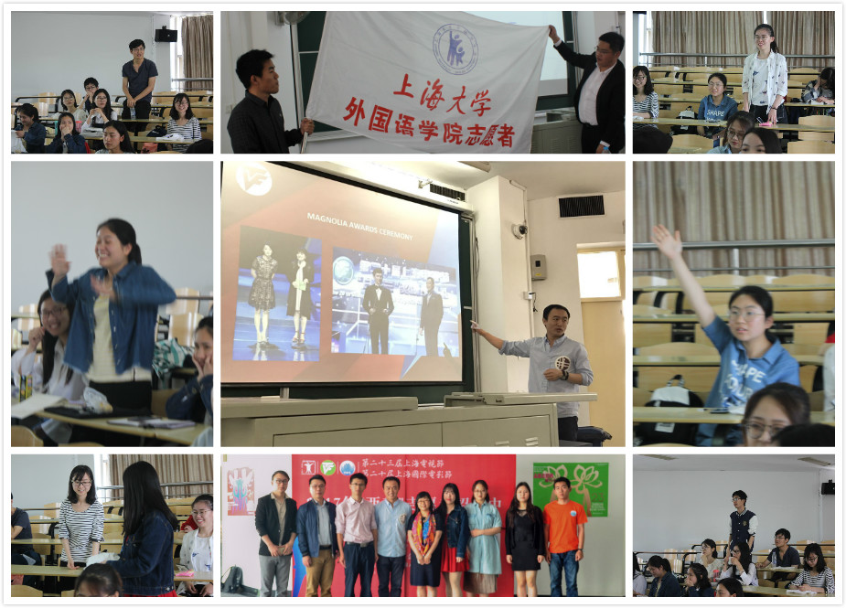 随后,上海国际影视节中心市场部总监杨乐乐先生用流利的英语介绍了上海电视节和上海国际电影节的基本情况以及志愿者的主要工作。由"Who we are"展开,杨先生向我们介绍了两节的主要流程和不同的项目、场所。由"What to expect to work"引出了两节中志愿者的主要工作分布以及内容。"what it takes to be a volunteer",杨先生提到"passion, dedication and knowledge"这三个关键词, 即对于志愿者工作的激情、奉献精神、扎实的英语功底及对于影视的兴趣和相关知识储备。杨先生的介绍与分享使我们对"两节"有了更清晰的认识、更浓厚的兴趣。